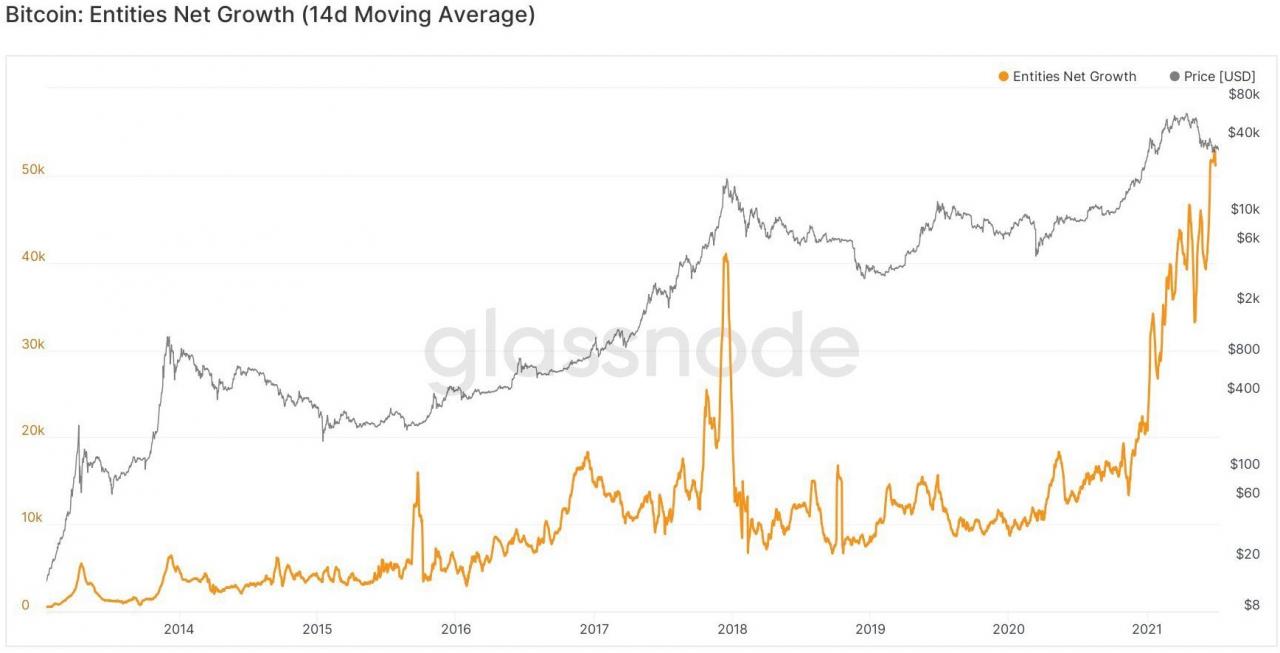 一些分析师强调的一个可能的看涨指标是“实体净增长”比特币指标,随着 BTC 的价格跌至 40,000 美元以下,该指标在最近几周攀升至新高。