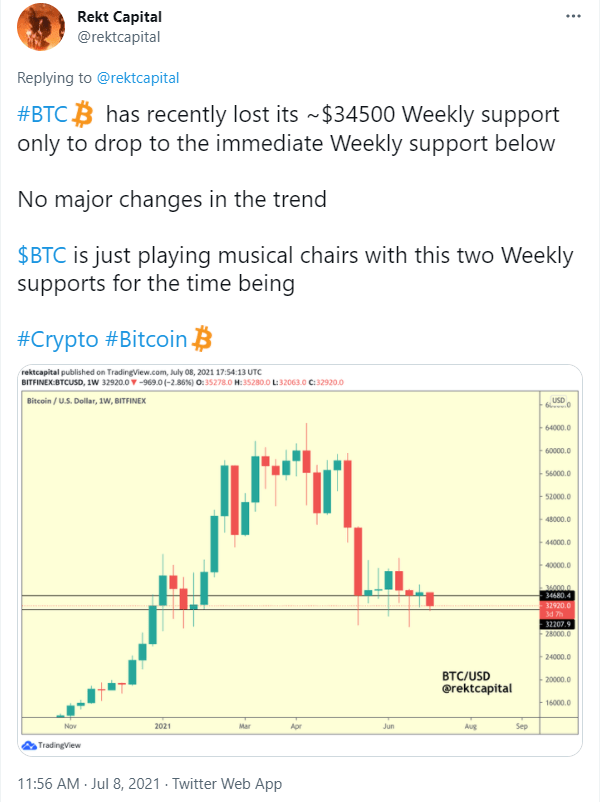虽然 BTC 价格确实跌破了接近 34,500 美元的每周支撑位,但匿名加密货币 Twitter 分析师 Rekt Capital 很快指出,价格在接近 32,200 美元的另一个既定支撑位获得支撑,导致“趋势没有重大变化”。