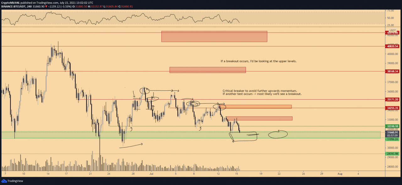 “比特币没有守住 32.4K 美元的支撑位,而是下跌了,它面临最终的支撑区域(31-31.5K 美元区域),”他在当天早些时候总结道。