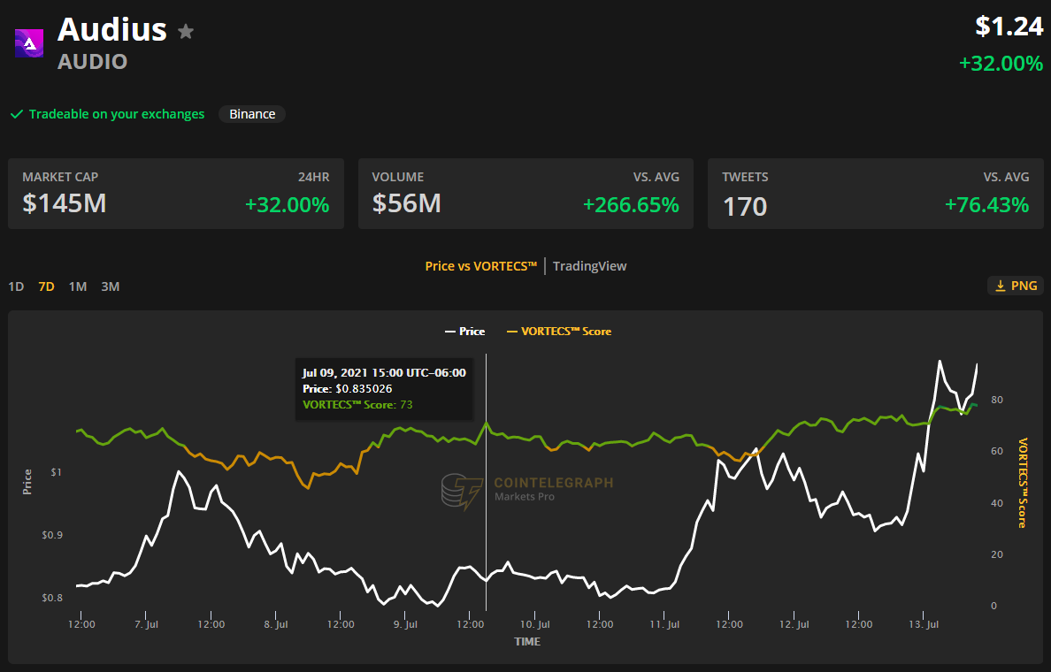 来自 Cointelegraph Markets Pro 的 VORTECS™ 数据于 7 月 9 日开始检测到 AUDIO 的看涨前景,在最近的价格上涨之前。
