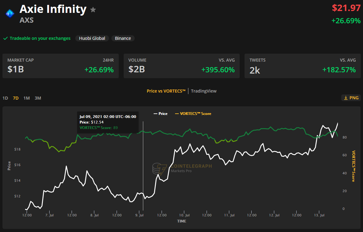 如上图所示,AXS 的 VORTECS™ 分数于 7 月 7 日开始变为深绿色,并在 7 月 9 日攀升至 89 的高位,大约在价格从 11.18 美元上涨 97% 至 22.14 美元的历史新高之前的 5 小时接下来的四天。