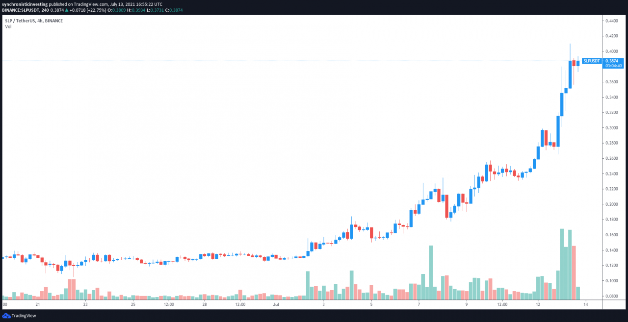 Cointelegraph Markets Pro 和 TradingView 的数据显示,在过去的 24 小时内,SLP 的价格从 7 月 12 日的 0.264 美元低点上涨至 7 月 13 日的 0.41 美元,比其历史高点 0.419 美元低不到两美分.