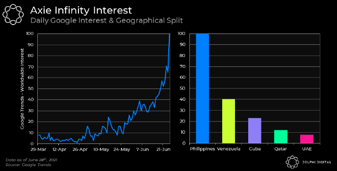 Delphi Digital 最近的一份报告强调,“自 Ronin 推出以来,人们对 Axie 生态系统的兴趣以指数级增长”,其中菲律宾、委内瑞拉、古巴、卡塔尔和阿拉伯联合酋长国 (UAE) 的增长最快接近四月底。