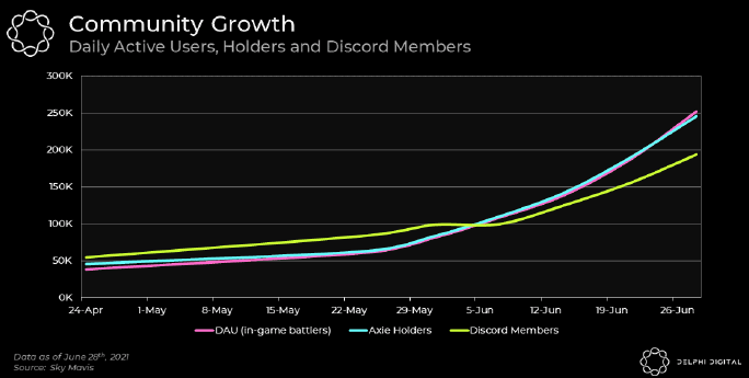 兴趣的增加导致了过去两个月新用户的涌入,每日活跃用户、独立 Axie 持有者和 Discord 成员数量的增长都证明了这一点。