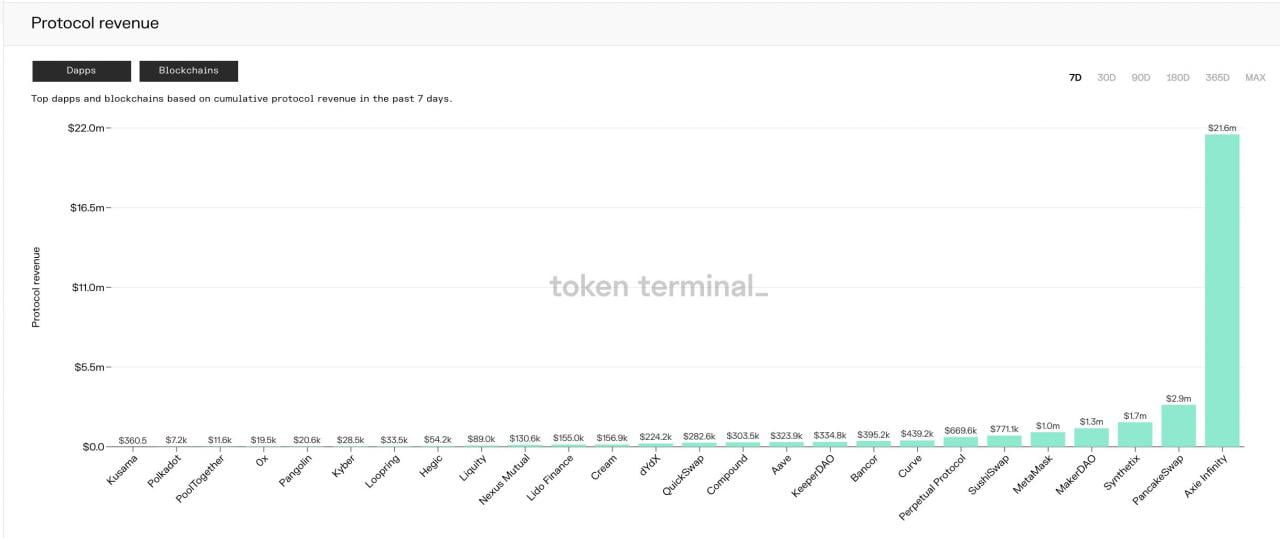 为了帮助将 Axie Infinity 生态系统产生的收入增长的重要性纳入背景,在过去一周中,该协议产生的费用比所有其他加密货币应用程序的总和还要多。