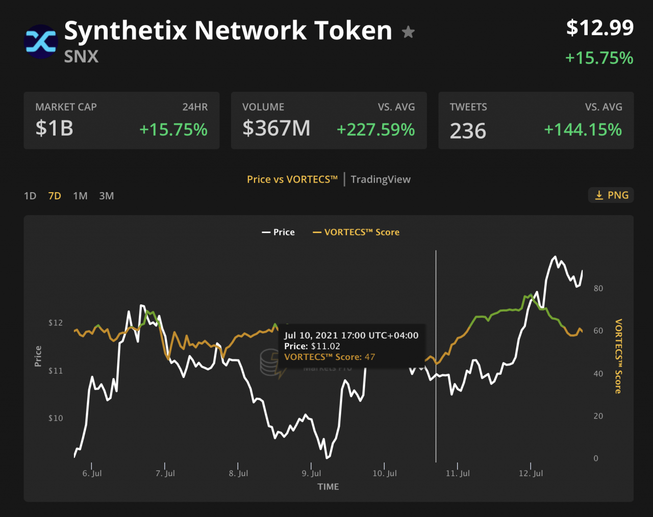 如上图所示,VORTECS™ Score 在周日午夜闪烁绿色,最高得分为 79——高于 24 小时内的 47——此后价格继续攀升至 13.88 美元。
