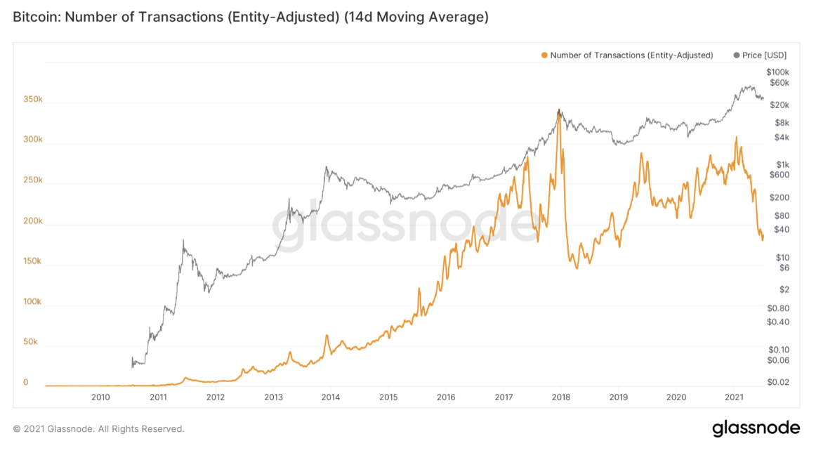 比特币交易数字 14 天移动平均线图。 资料来源:威廉克莱门特/ Glassnode