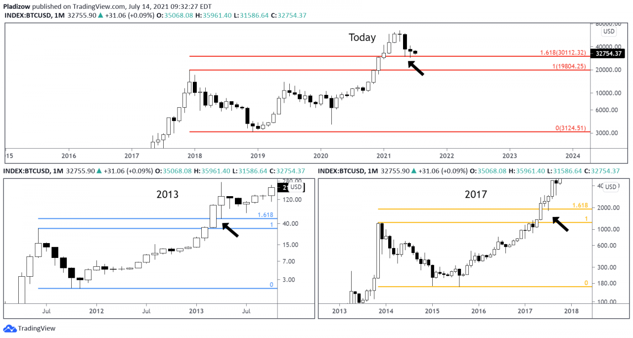 “它大约是 1.618 Fib Ext。 在之前的两个周期中,它被测试为支撑,但从未在月度K线走势图上收于下方,”随附的关于斐波那契现象的评测中写道。