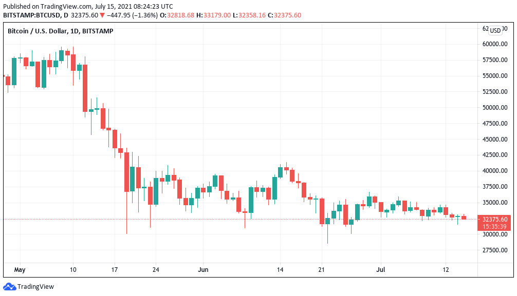 比特币仍然比最近的历史高点低 50%,没有方向,这导致人们倾向于看跌八周的横盘整理结果。