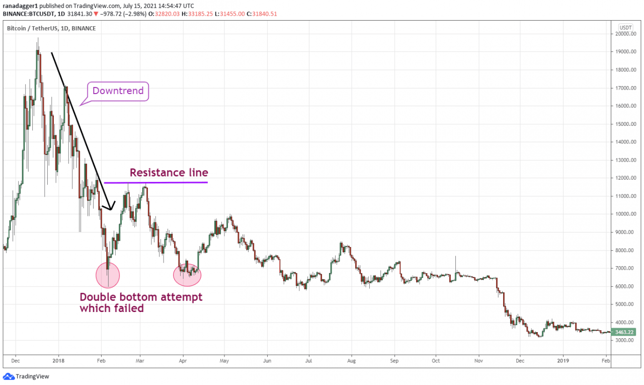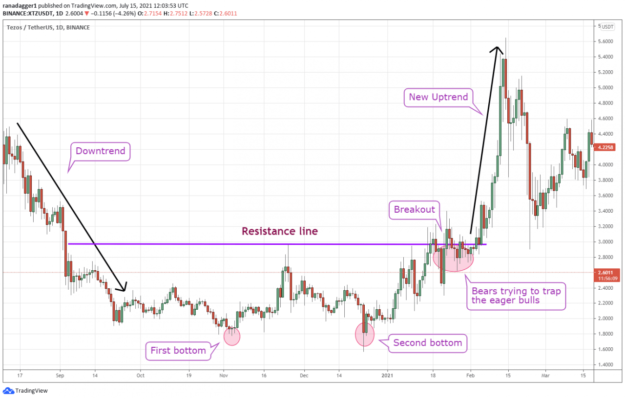 很多时候,交易者抢占双底并在价格突破阻力线之前买入。 这有时会导致损失,因为模式最终可能永远不会完成。