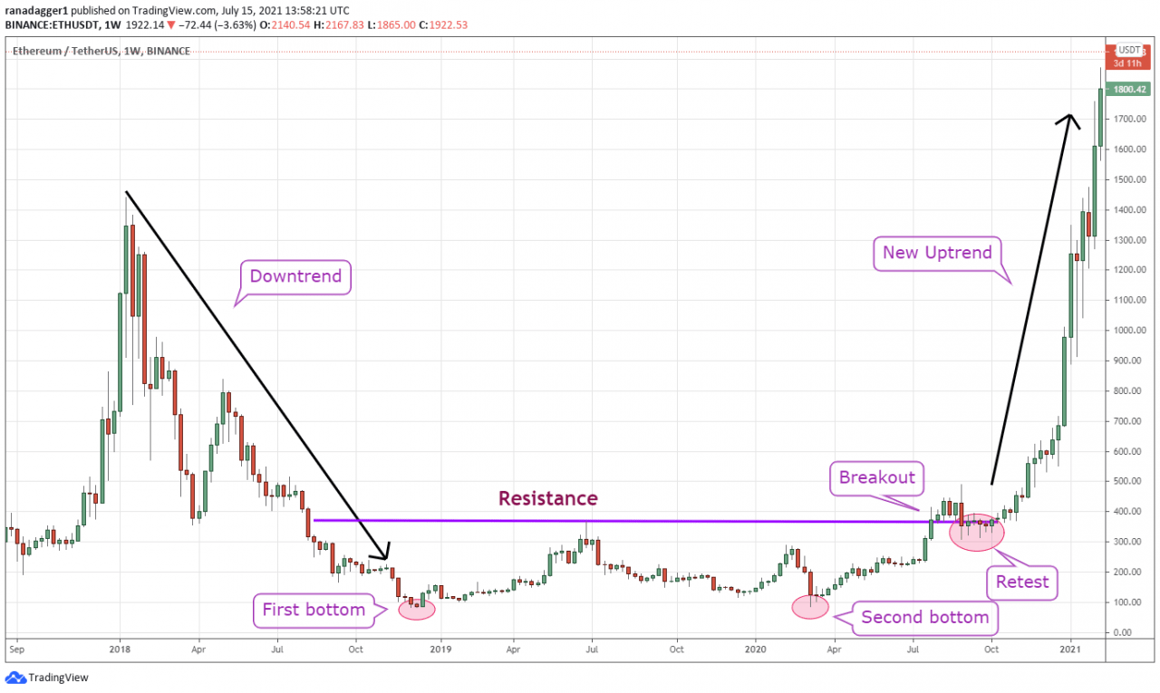 以太坊(ETH)自 2018 年 1 月达到 1,440 美元的高位以来一直处于强劲的下跌趋势。当价格在 2018 年 12 月达到 81.70 美元时供不应求,导致形成第一个底部。 此后,价格在 2019 年 6 月回升至 366.80 美元,空头再次介入。