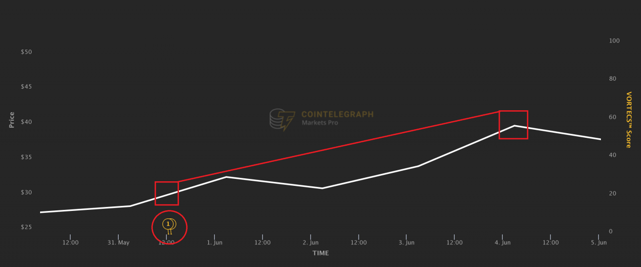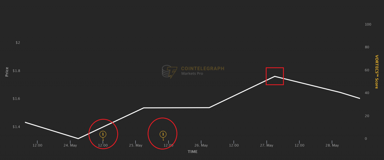 当这条推文出现时,随着推特人群涌入行动,逐渐消退的势头得到进一步提振。 一天半后达到了 1.77 美元的峰值(K线走势图中的红色框),这意味着总体 Markets Pro 用户可以从该事件中获得 17% 的利润,并在收到初始警报后不久设置入场点。