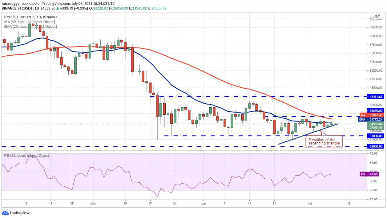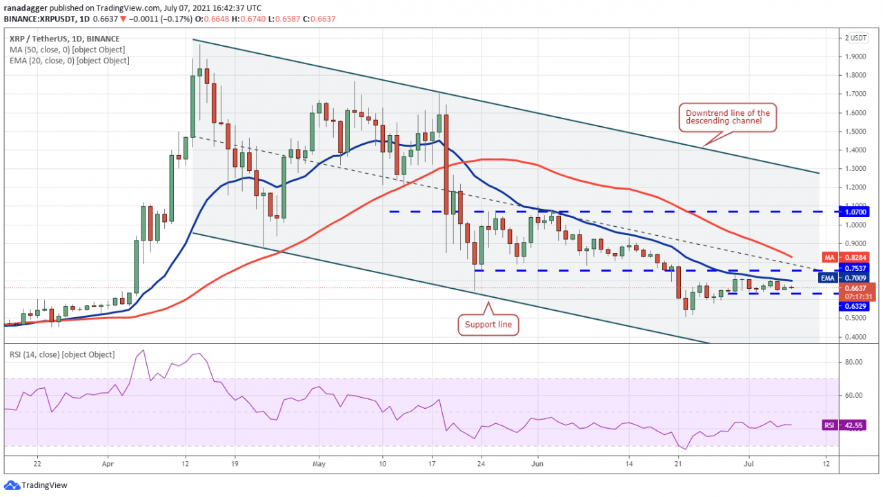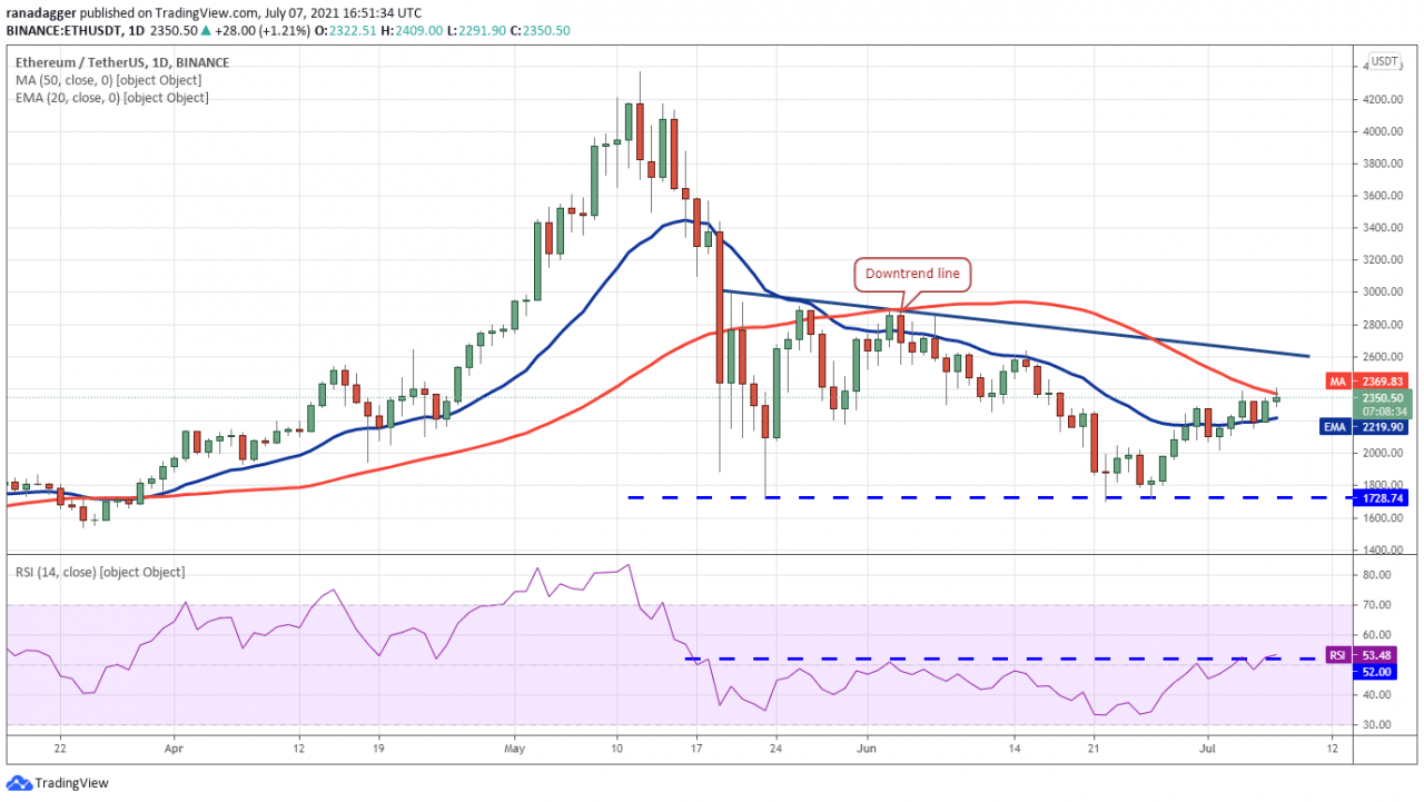 如果他们成功,ETH/USDT 货币对可能会反弹至下跌趋势线,空头可能会再次在此形成强阻力。 如果价格从中转跌但从 20 日均线反弹,则突破下跌趋势线的可能性增加。