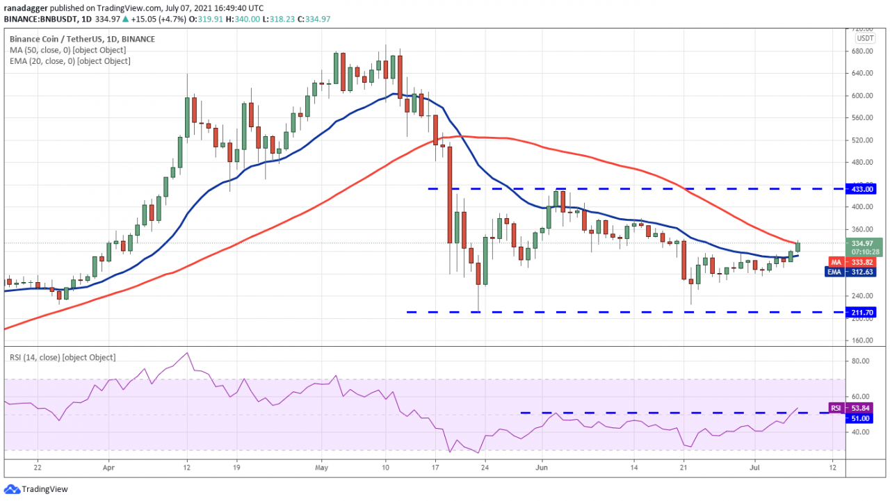 币安币(BNB)在 7 月 6 日突破了 20 天均线(312 美元),这表明需求正在回升。 空头现在可能会尝试积极捍卫 50 日均线(333 美元)。
