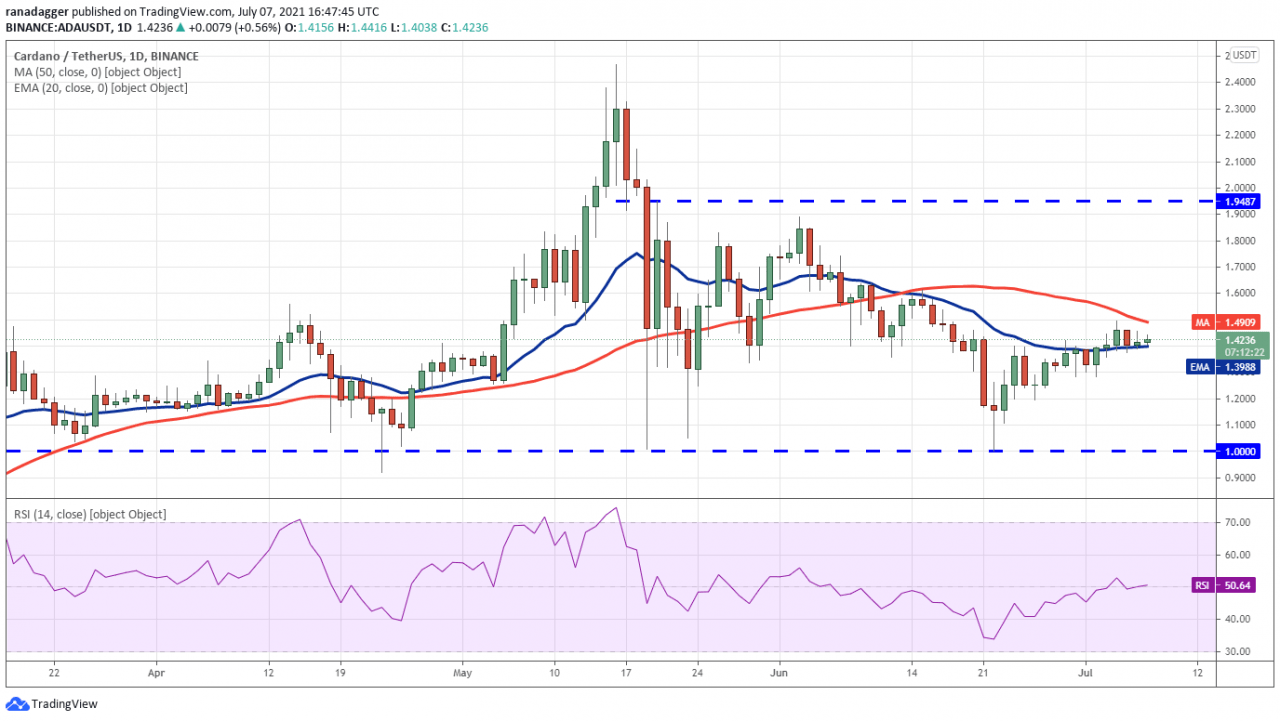 卡尔达诺(ADA)过去三天一直在 20 日均线(1.39 美元)上方交易,但多头未能挑战 50 日均线(1.49 美元)。 持平的 20 天 EMA 和接近中点的相对强弱指数 (RSI) 表明供需平衡。
