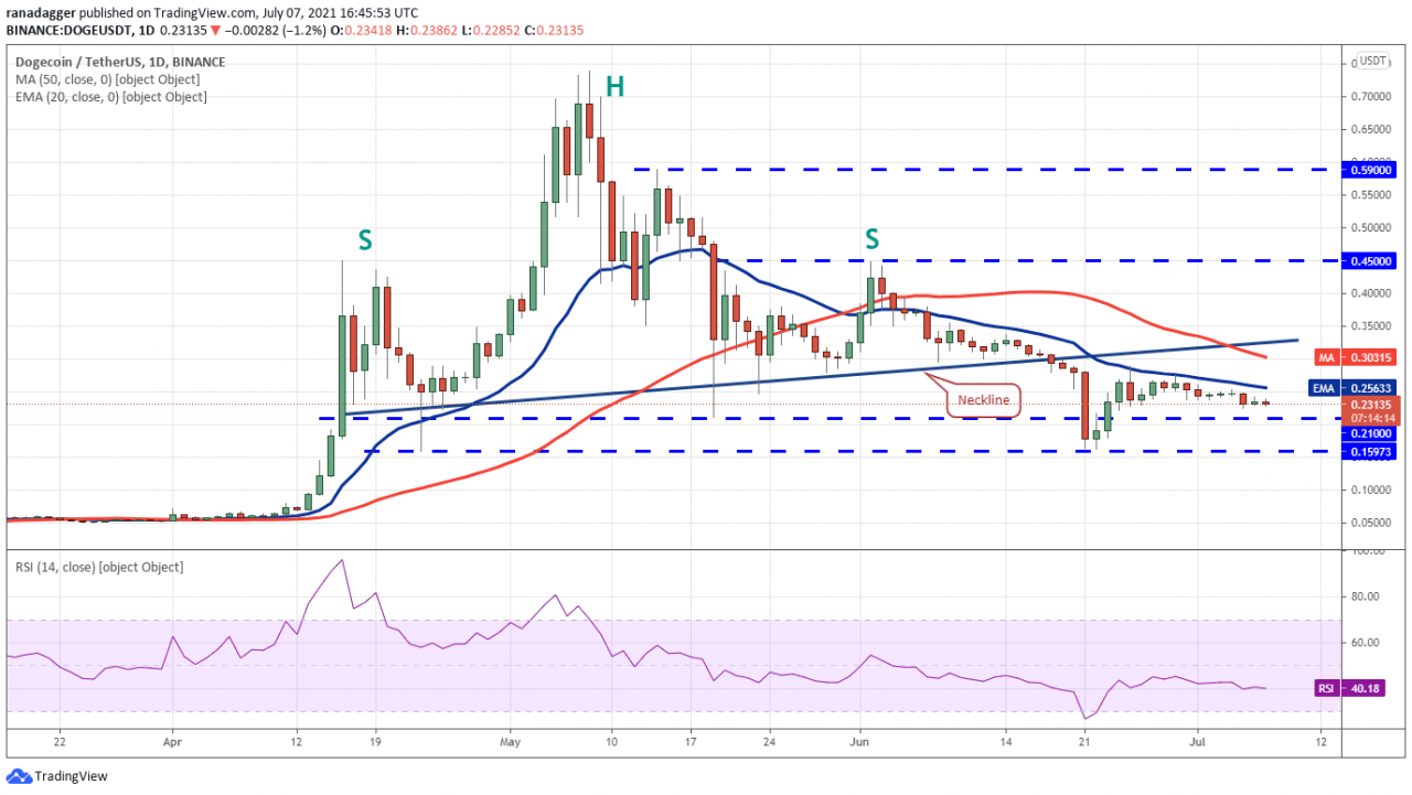 狗狗币(DOGE)在 7 月 5 日从 20 天 EMA(0.25 美元)回落,但空头未能将价格跌破 0.21 美元的支撑位。 这表明抛售在较低水平上枯竭。