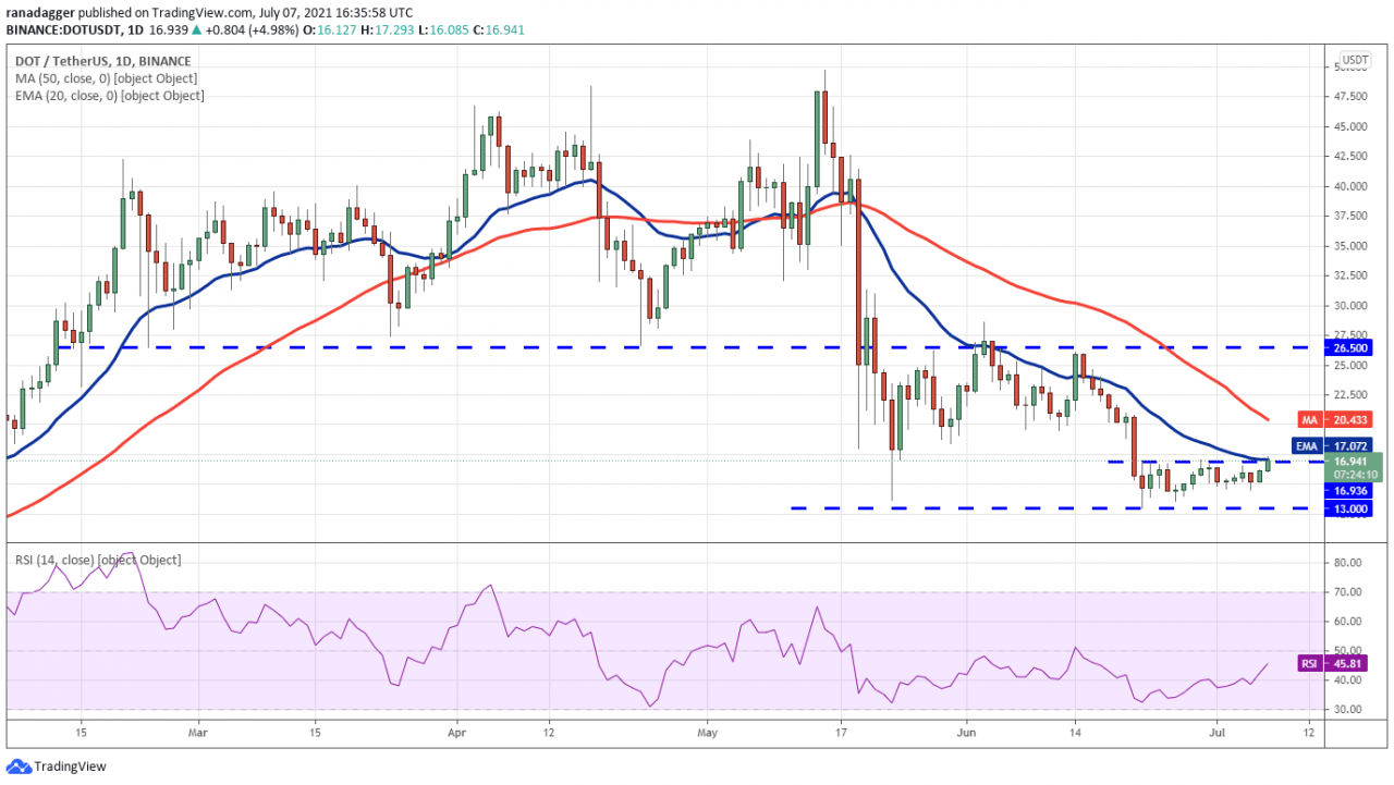 多头正试图将 Polkadot(DOT)推至上方阻力位 16.93 美元和 20 天均线(17.07 美元)上方。 如果他们成功,山寨币可能会反弹至 50 天均线(20.43 美元),空头可能再次在此形成强阻力。