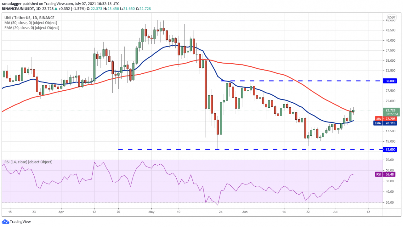 多头在 7 月 5 日捍卫了 20 日均线(20.11 美元),这表明情绪可能发生变化。 买盘在 7 月 6 日继续,多头将 Uniswap (UNI) 推高至 50 日均线(22.20 美元)上方。 空头试图在这个水平上阻止救济反弹,但今天的买家已经克服了这一点。