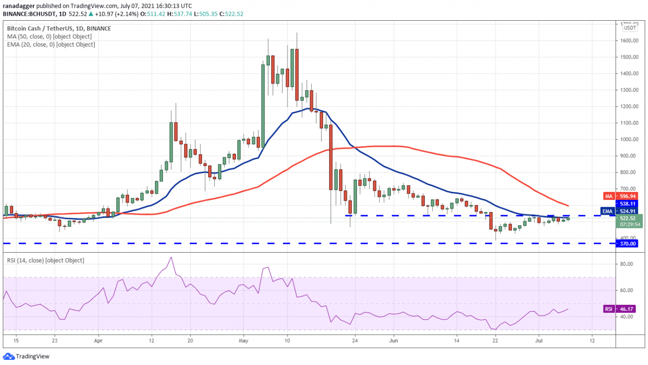 持平的 20 天 EMA(524 美元)和高于 46 的 RSI 表明多头正试图成交量土重来。 如果买家将价格推高至 538.11 美元以上,BCH/USDT 货币对可能会开始上涨至 650.35 美元,然后是 800 美元。