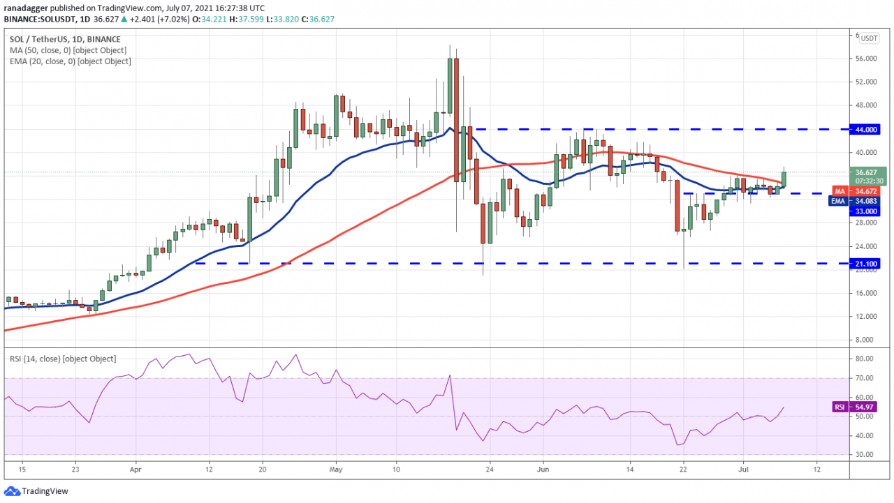 Solana (SOL) 过去几天一直在 50 天均线 (34.67 美元) 和水平支撑位 33 美元之间交易。 这表明多头并未在 50 日均线附近抛售头寸,而是在 33 美元以下逢低买入。