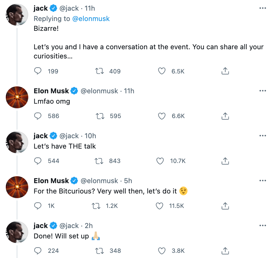马斯克以性暗示回应了多尔西——他似乎从不羞于分享这些材料——然后同意与他坐下来在活动中讨论比特币。