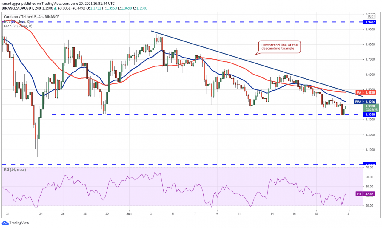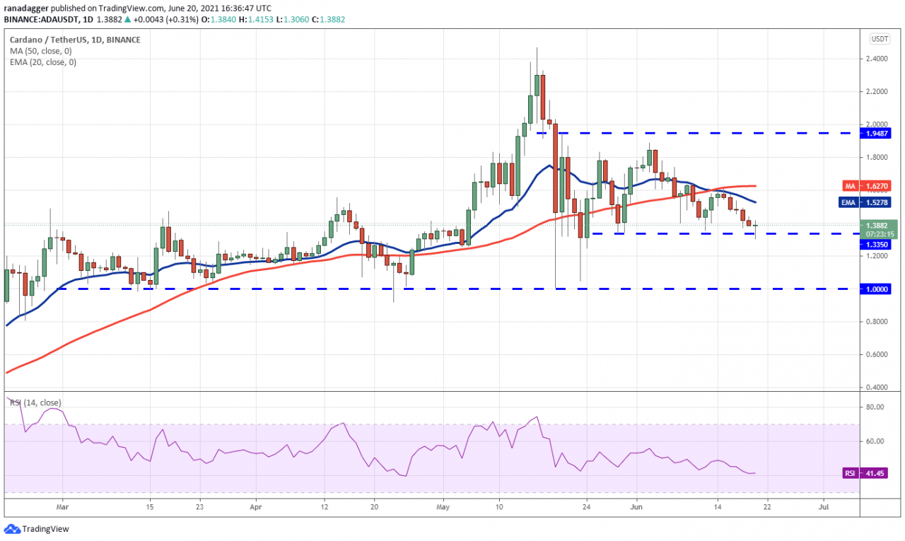 空头现在将尝试将价格压低至 1.33 美元至 1.24 美元的支撑区域下方。 如果他们设法做到这一点,ADA/USDT 对可能会跌至 1 美元的关键支撑位。 向下倾斜的 20 天 EMA 和 RSI 低于 42 表明空头处于控制之中。