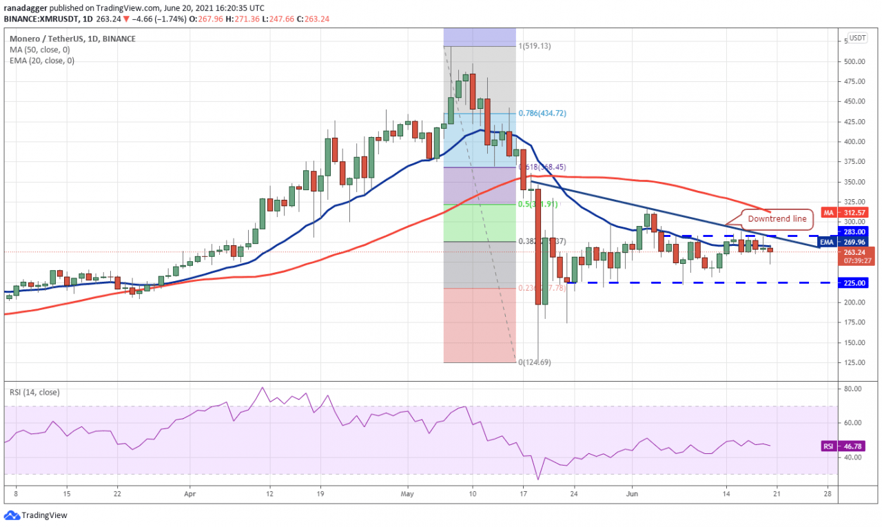 如果价格从 225 美元反弹,买家将再次尝试将价格推高至下跌趋势线上方。 如果他们这样做,XMR/USDT 货币对可能会挑战 50 天均线(312 美元),然后升至 347 美元。