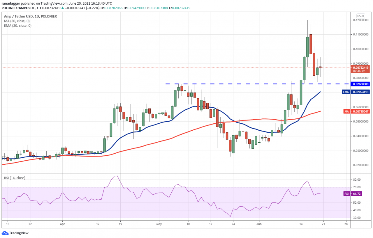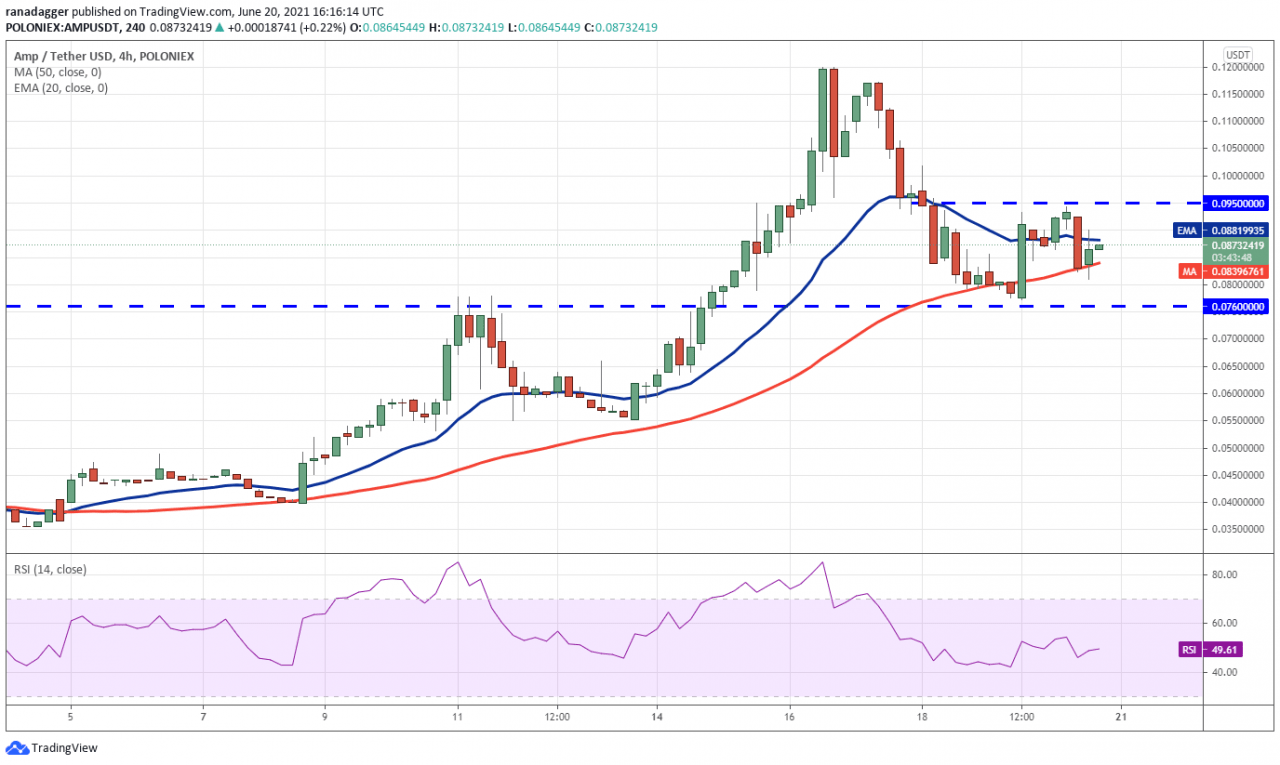 Amp 在 6 月 14 日突破了 0.076 美元的强劲阻力位,并在 6 月 16 日创下历史新高 0.12 美元。然而,6 月 17 日的盈利记录已经开始回调,跌至 0.076 美元的突破水平。