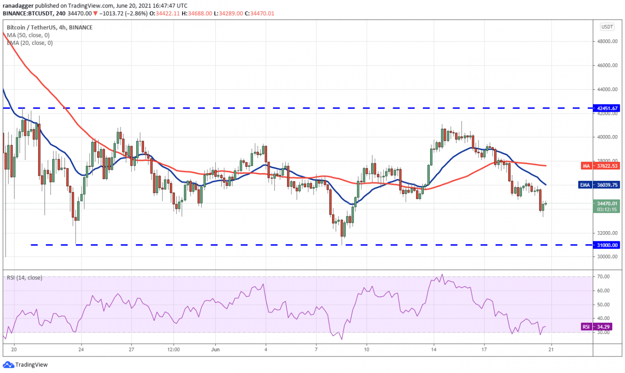 卖家现在将尝试将价格降至 31,000 美元的区间支撑位。 20 天 EMA 已开始下跌,相对强弱指数 (RSI) 低于 41 表明空头占上风。