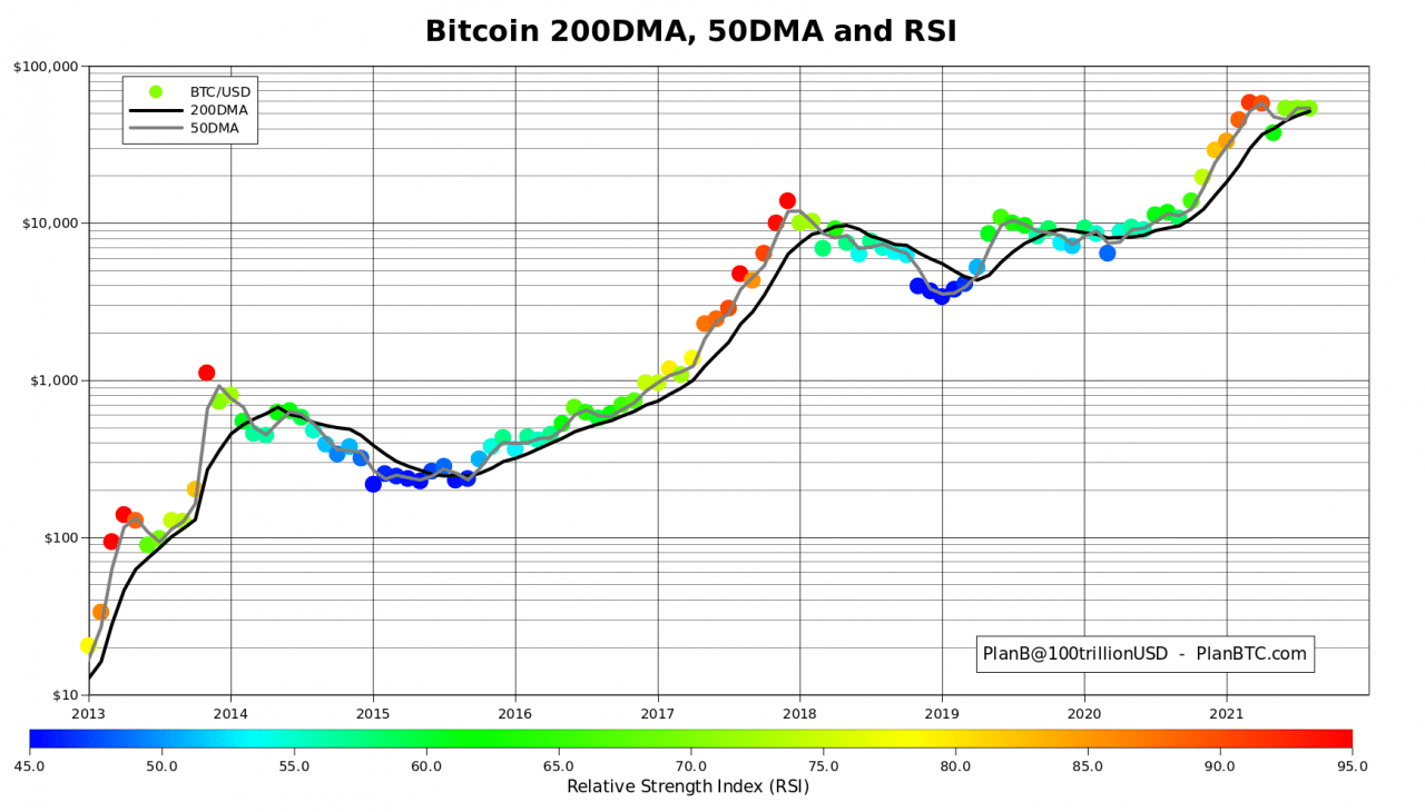 BTC/USD 200 天、50 天移动平均线、相对强弱指数 (RSI) 和数月减半。 资料来源:PlanB/推特