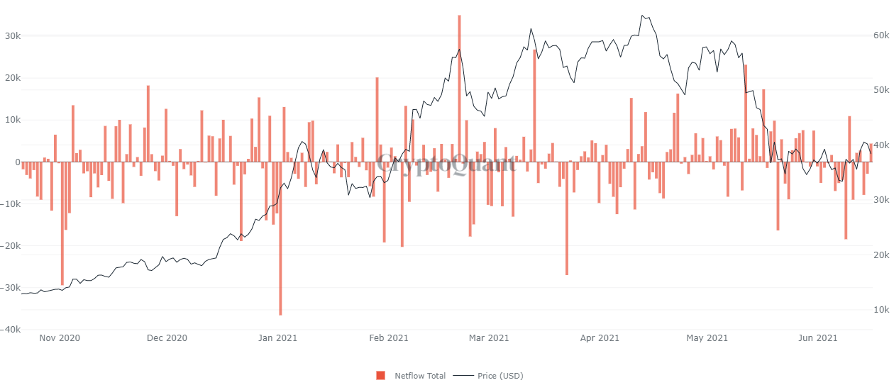 随着抛售加剧,BTC 流入交易所的净流量显着增加,这种抛售压力以及缺乏逢低买入的买家使比特币保持在 38,000 美元以下。