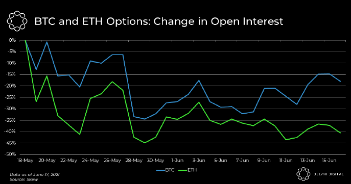 Delphi Digital 表示,“自 5 月中旬以来,BTC 和 ETH 期权的未平仓量一直在下跌”,但最近 BTC 的期权未平仓量略有增加。 以太坊的这个数字一直停滞不前,“这表明交易者正试图为比特币的走势做好准备。”