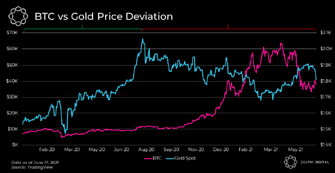 BTC 与黄金价格偏差。 资料来源:德尔福数码
