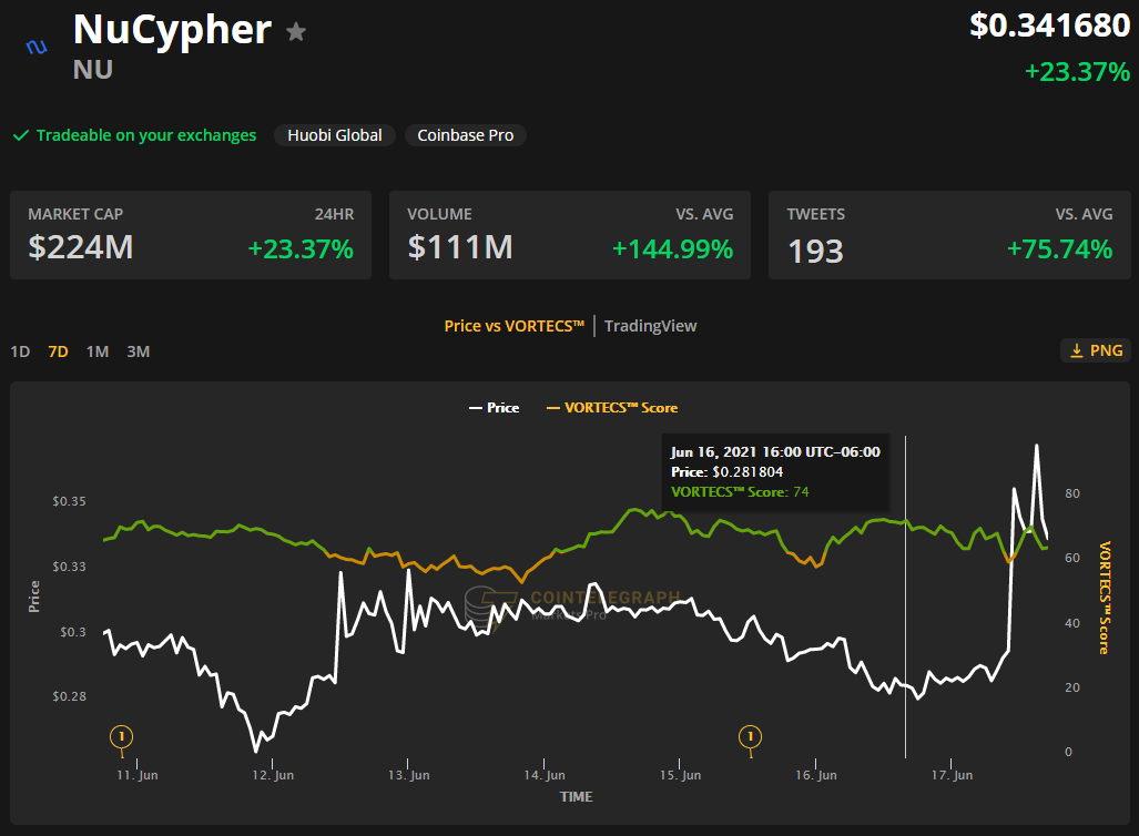如下图所示,Cointelegraph Markets Pro 的 NewsQuake™ 服务于 6 月 15 日接收了 NuCyper 和 Keep 宣布的合并,随后 VORTECS™ 分数在 6 月 16 日上涨至 74山寨币上涨 44% 前 15 小时。
