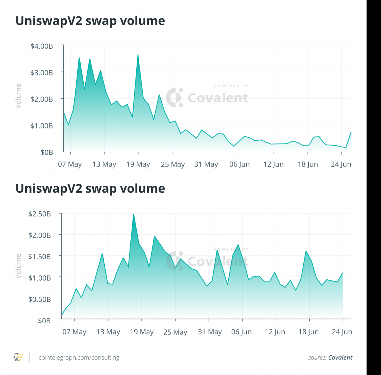 Uniswap v3 在 5 月下旬交易量超过 v2 后,一直保持领先地位。 然而,v3 的交易量在过去五周内略高于 v2。 不过,Uniswap v3 没有明显上涨趋势的迹象。 该协议在 6 月份的掉期量波动较大,但其峰值低于 5 月份。
