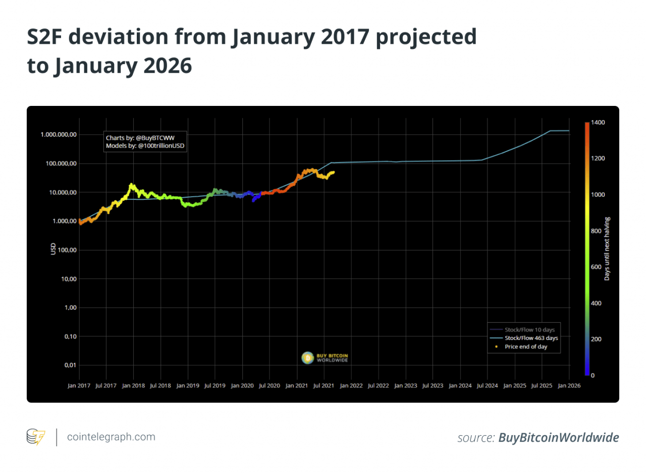 Twitter 用户 PlanB 的股票流量(S2F)模型一直是最准确的定量模型之一,试图评估和预测比特币的价格。 它是基于一定时期内资产注入流通的供应量来实现的。 根据该模型,比特币的价格应该已经超过 100,000 美元,在 105,000 美元大关附近交易。