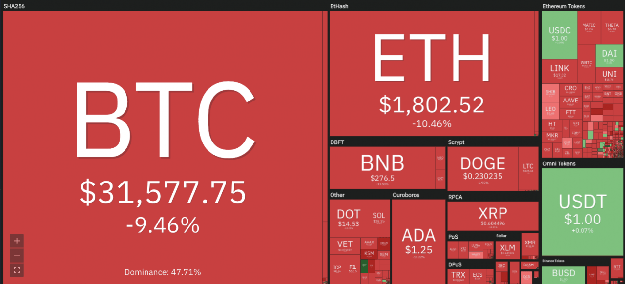 让我们研究前 10 种加密货币的K线走势图,以确定如果下跌趋势继续下去可能会触及的关键支撑位。