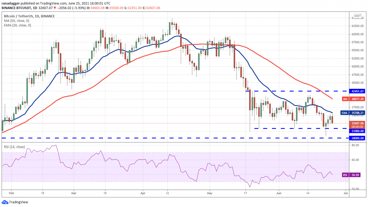 比特币从今天的 20 天指数移动平均线(35,788 美元)反弹至 31,000 美元至 28,000 美元的支撑区域。 向下倾斜的移动平均线和负区域的相对强弱指数(RSI)表明空头的优势。