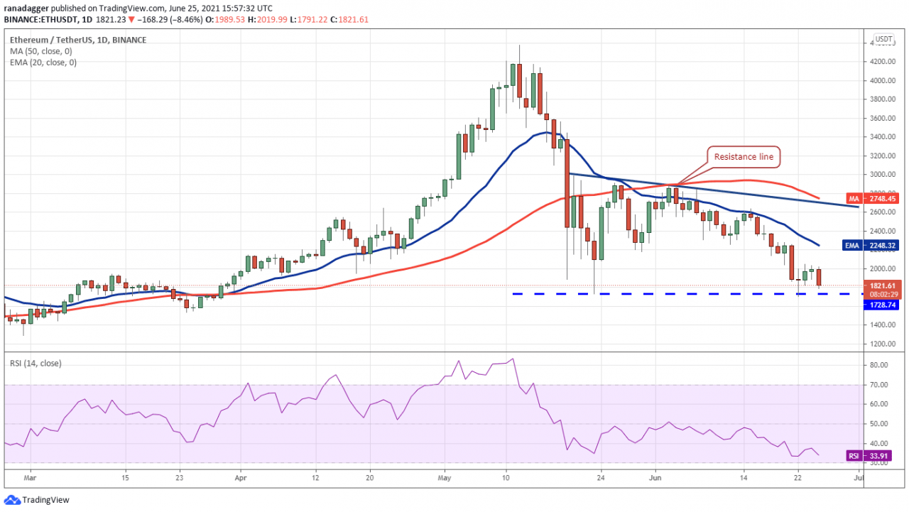 6 月 23 日,以太坊 (ETH) 从 1,728.74 美元的支撑位反弹至 2,045 美元。这表明缺乏更高水平的买家。 两条均线均已转跌,RSI 接近超卖区域,表明阻力最小的路径是下行。