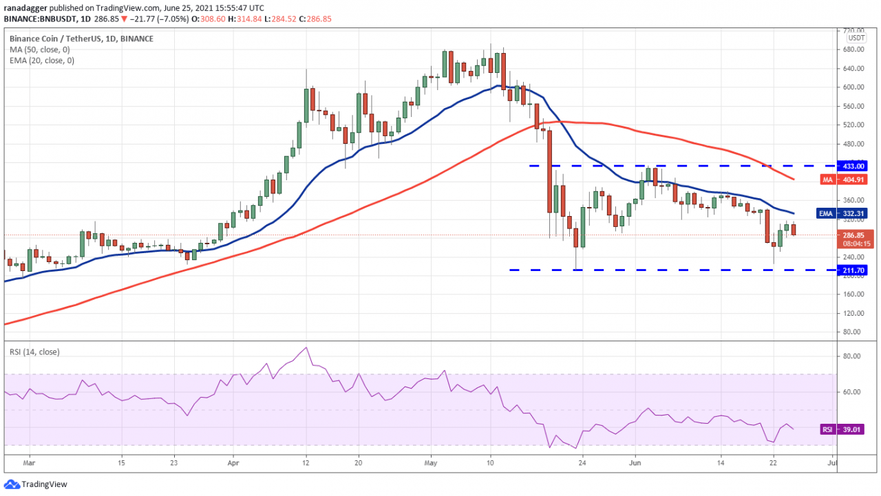 币安币(BNB)从 211.70 美元的支撑位反弹,在 20 天均线(332 美元)处面临强劲阻力。 这表明市场情绪仍然消极,交易员逢高抛售。