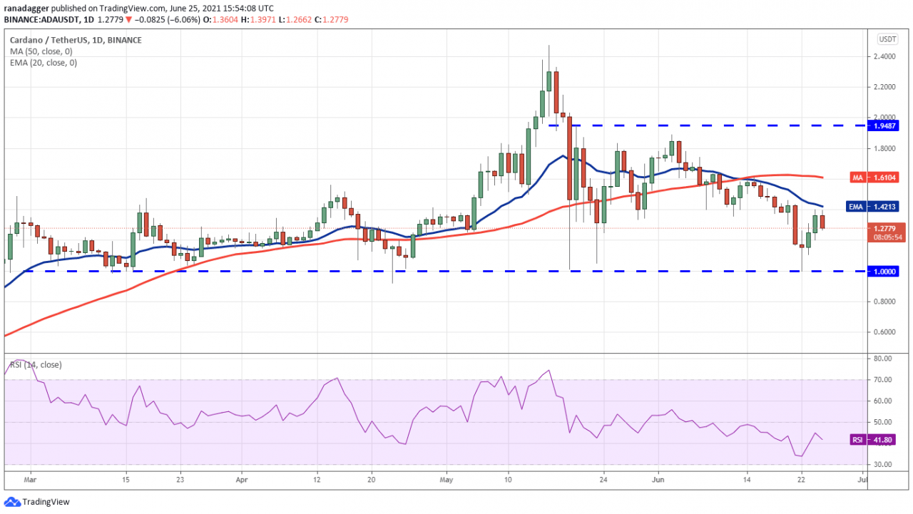 卡尔达诺(ADA)在 6 月 22 日从 1 美元的支撑位反弹,但多头似乎在 20 天均线(1.42 美元)处碰壁。 这表明空头还没有认输,正试图保持优势。