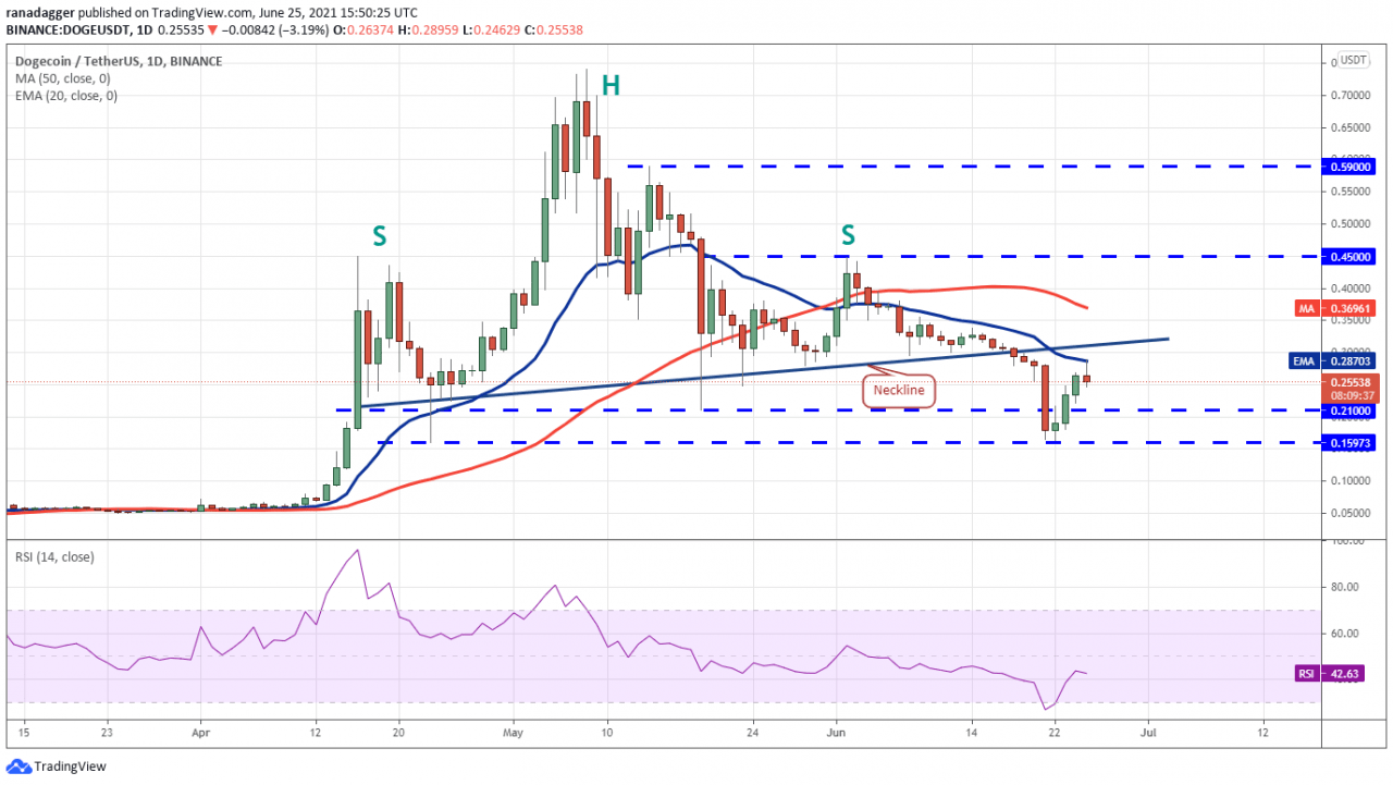 狗狗币(DOGE)在 6 月 22 日从 0.15 美元的支撑位反弹,今天达到 20 天均线(0.28 美元)。 在过去三天的大幅反弹之后,空头可能会积极捍卫 20 日均线和颈线之间的区域。