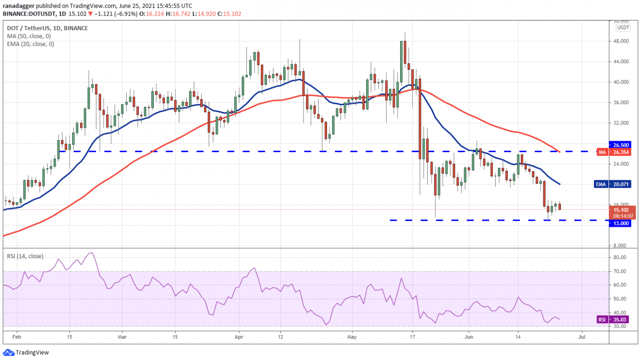 Polkadot(DOT)从 13 美元的反弹一直很弱,因为多头甚至无法将价格推高至 20 天均线(20 美元)。 这表明交易者并不急于在当前水平买入。