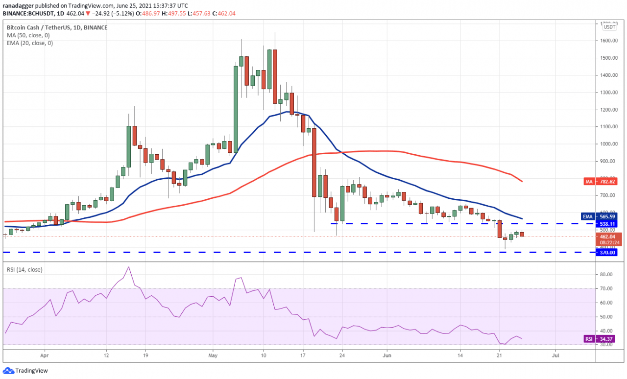 如果他们这样做,BCH/USDT 货币对可能会跌至 300 美元的心理支撑位,然后跌至 270 美元。 与此假设相反,如果价格再次从 370 美元反弹,则表明在较低水平上有强劲买盘。 然后多头将试图将价格推高至 20 天均线(565 美元)上方。 如果发生这种情况,该货币对可能会反弹至 50 天均线(782 美元)。