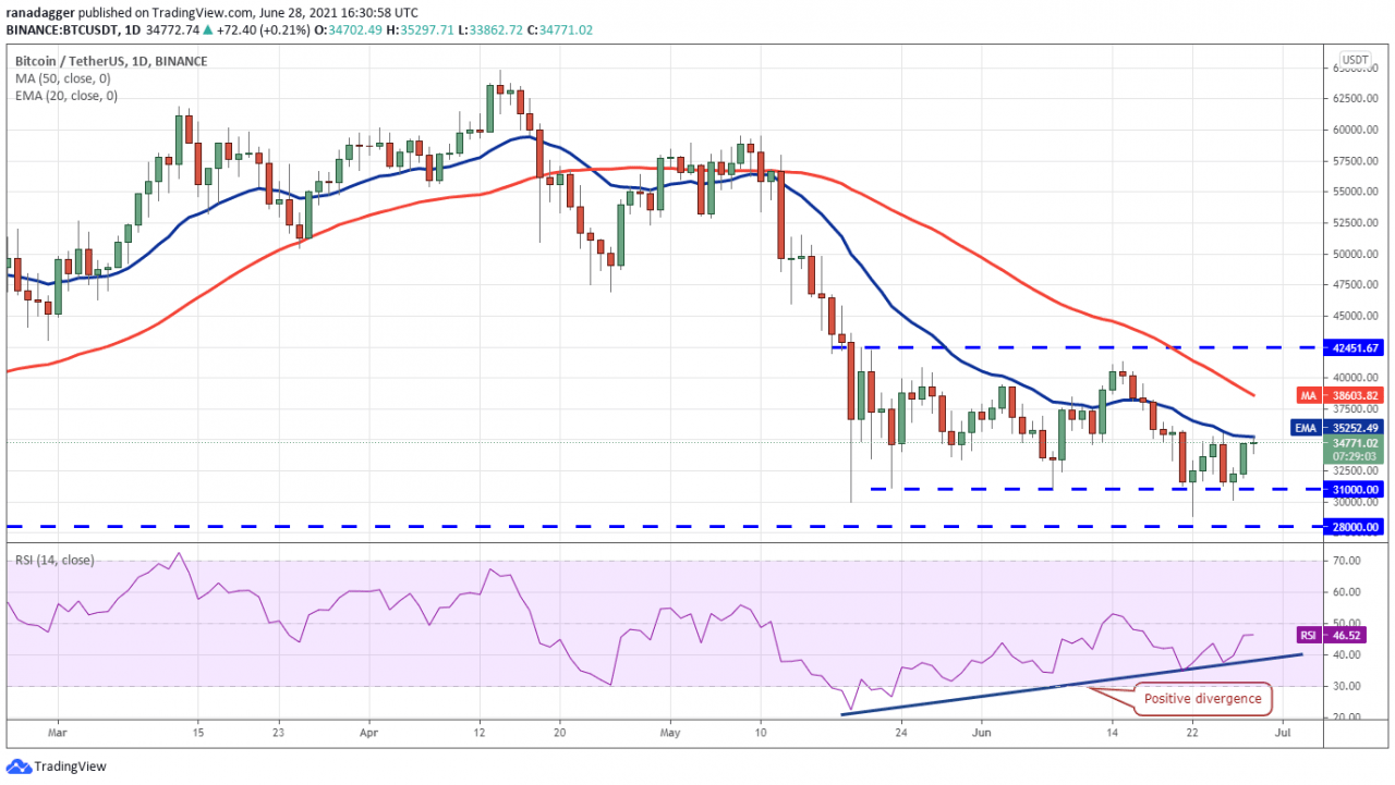 比特币再次面临 20 天指数移动平均线(35,252 美元)的阻力,但积极的迹象是多头并没有放弃太多。 相对强弱指数的正背离表明空头可能正在失去控制力。
