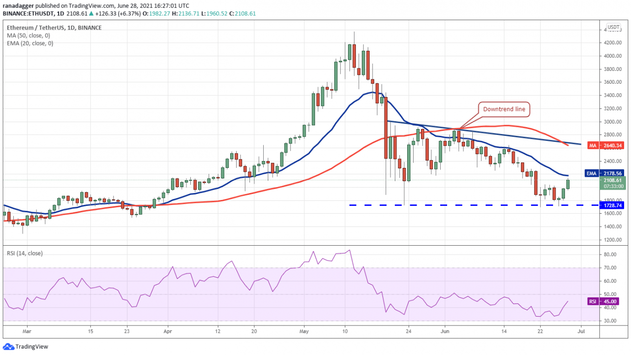 6 月 26 日,以太币 (ETH) 再次从 1,728.74 美元的支撑位反弹,表明在该水平上增持。 多头现在将尝试将价格推高至 20 天均线(2,178 美元)上方。 如果他们设法做到这一点,最大的山寨币可能会反弹至下跌趋势线。