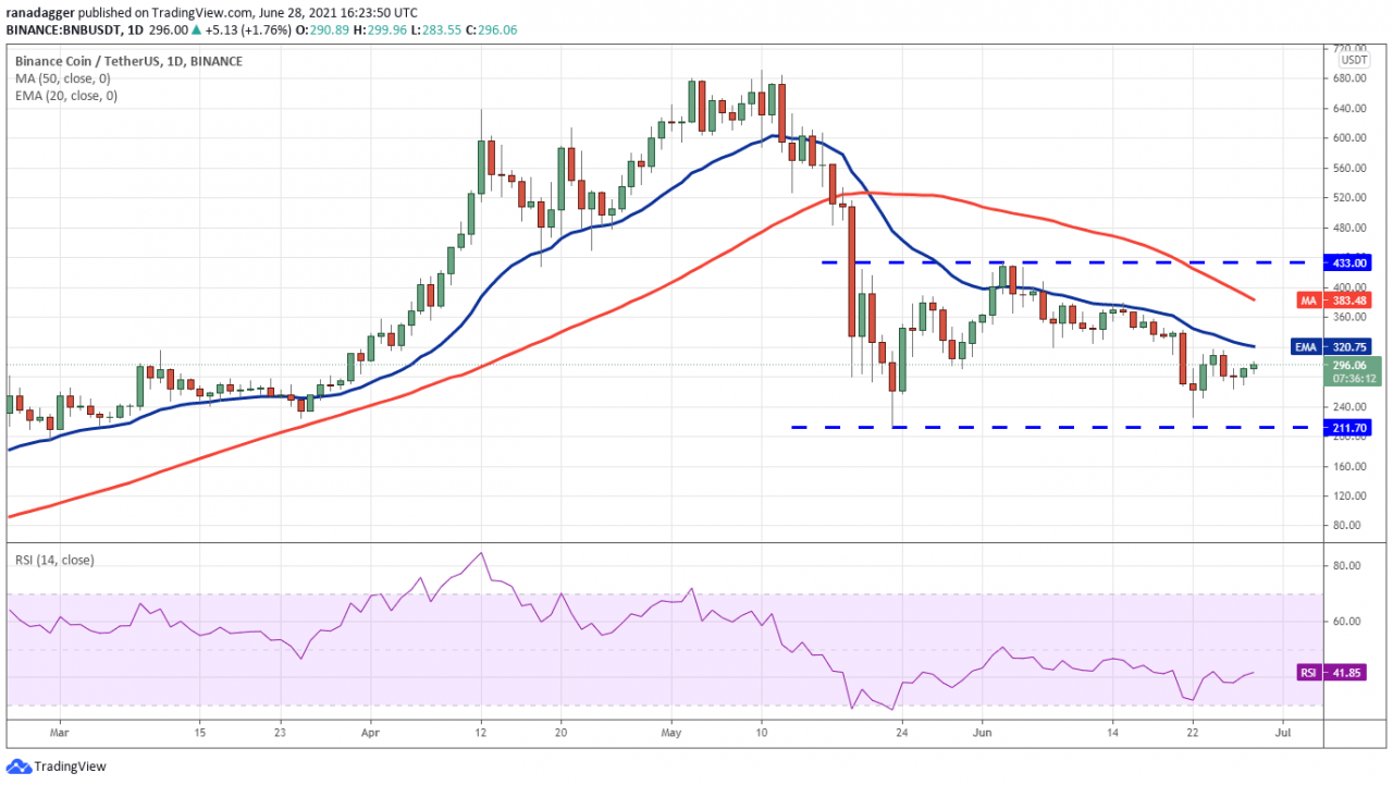 币安币(BNB)在 6 月 25 日刚好低于 20 天均线(320 美元)时回落,但空头无法将价格拉低至关键支撑位 211.70 美元。 这表明多头正试图在 264.26 美元处形成更高的低点。