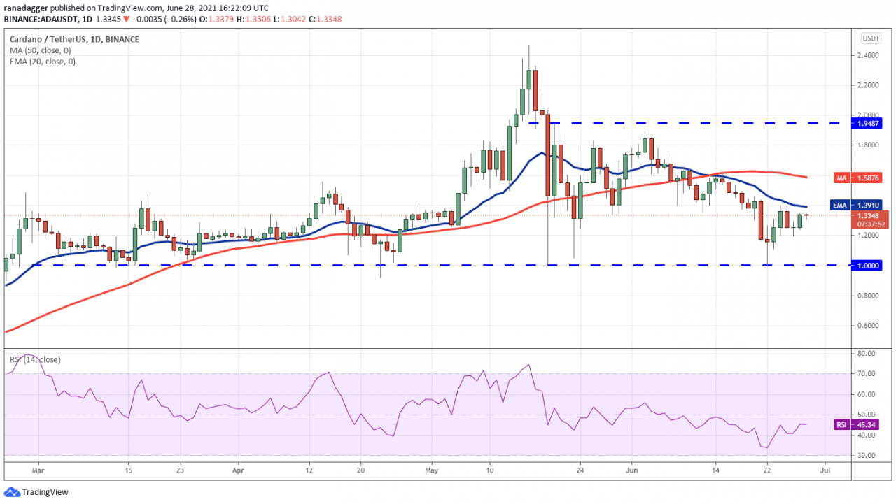 卡尔达诺(ADA)过去四天一直在 20 天均线(1.39 美元)和 1.20 美元之间交易。 这表明多头正试图在 1.20 美元处形成更高的低点。