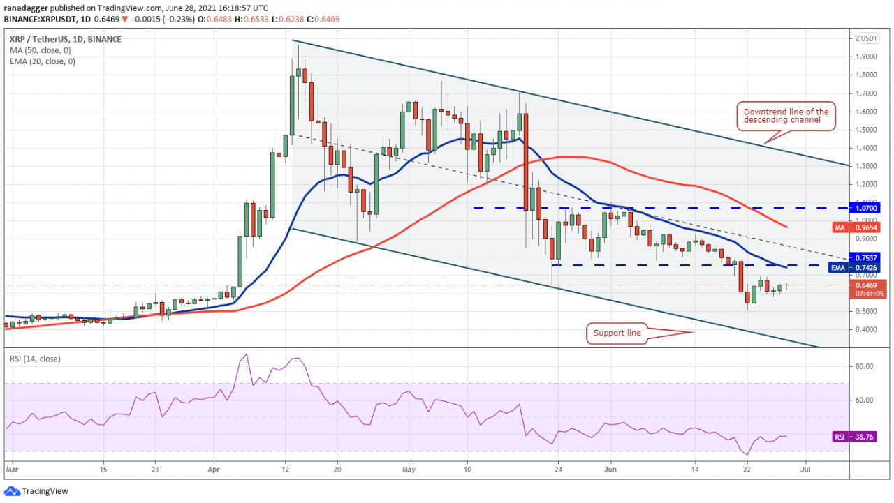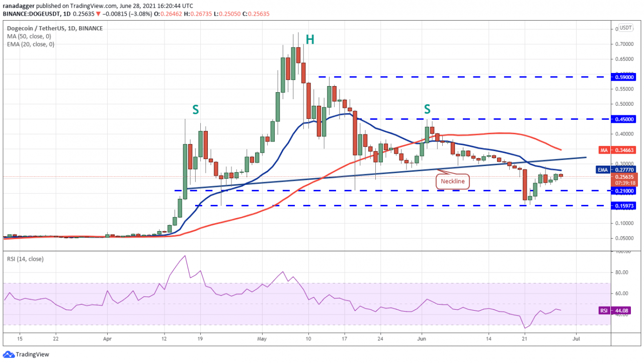 狗狗币(DOGE)无法在 6 月 25 日升至 20 天均线(0.27 美元)上方,但积极的迹象是多头在过去两天没有放弃太多。 这表明空头缺乏积极的抛售。