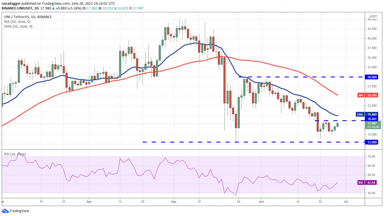 向下倾斜的移动平均线和负区域的 RSI 表明空头处于控制之中。 如果价格从上方阻力下跌,空头将试图将 UNI/USDT 货币对压低至 15 美元以下。